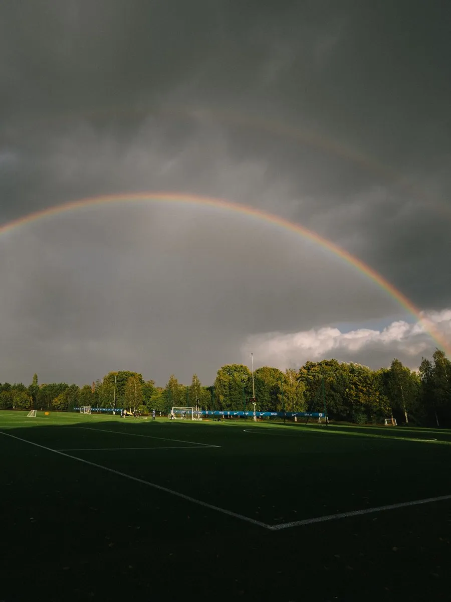 虎扑09月12日讯 雨后天晴!切尔西官方晒图:科巴姆基地上空出现彩虹。